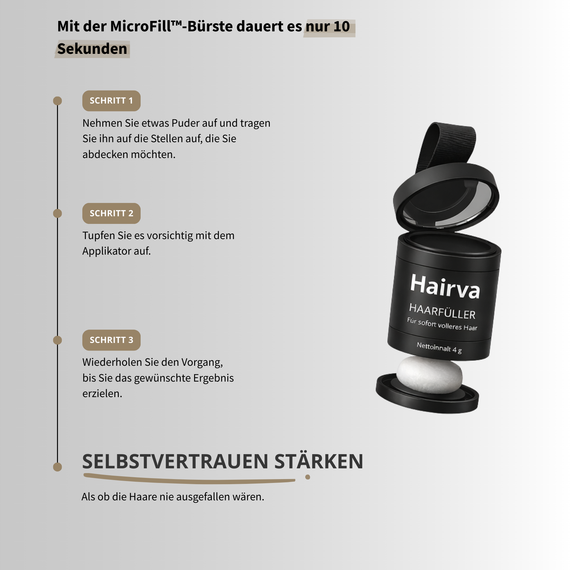 Die Bürste von Hairva™ Haarfüller bringt die Fasern gezielt dorthin, wo sie hingehören – für eine saubere, natürlich wirkende Abdeckung, die zuverlässig hält.